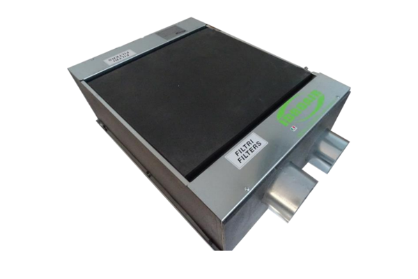 Modulo di recupero calore ad altissimo rendimento, senza ventilatori, da abbinare ad unità ventilanti per impianti di VMC collettiva. Dotata di un recuperatore di calore controflusso ad alta efficienza in polistirene attraverso il quale l’aria espulsa cede parte del proprio calore all’aria di rinnovo prima che sia immessa in ambiente. Il box di contenimento è realizzato con lamierati autoportanti in acciaio zincato coibentato con poliuretano adesivo. Progettato per essere installato all’interno di edifici residenziali viene montato orizzontalmente con ispezione sul lato inferiore. Disponibile in 2 grandezze con portata d’aria nominale di 150 e 260 m³/h, il range di funzionamento varia da 100 a 300 m³/h. Il sistema di filtrazione su entrambi i flussi è costituito da filtri sintetici pieghettati ad elevata superficie filtrante. Per tutte le unità la configurazione base prevede:
